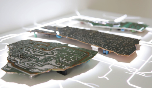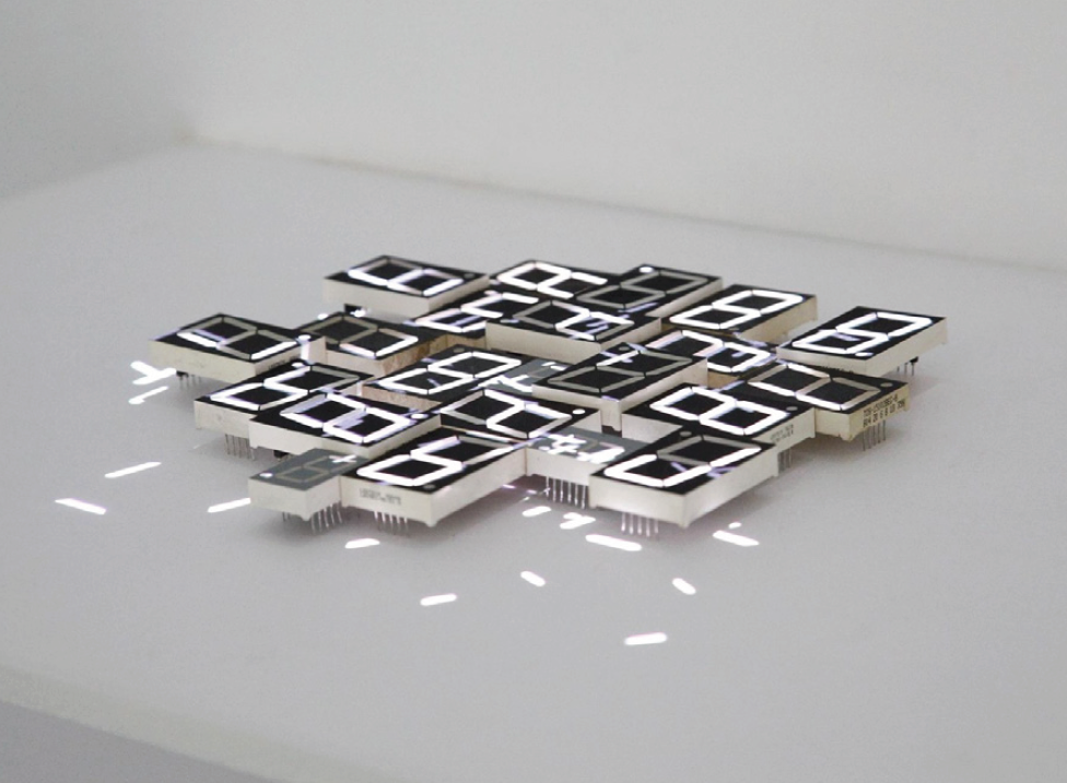 Discarded 7 segment displays, wood, projector, micro SD memory card.