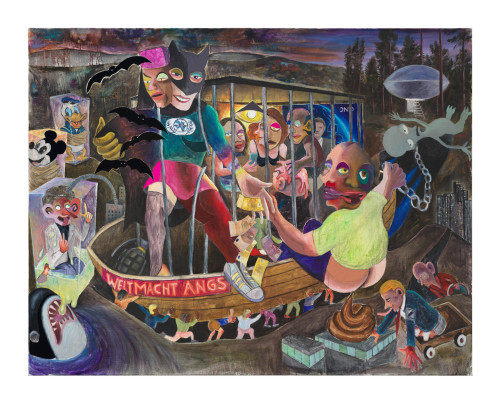 Welt macht Angst, 2020–2021 Oil and fabric on canvas 195 x 240 cm